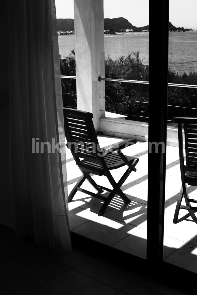 chairs, room, hotel, curtain, shadows, chair, railing, sea, rock, litters, window
