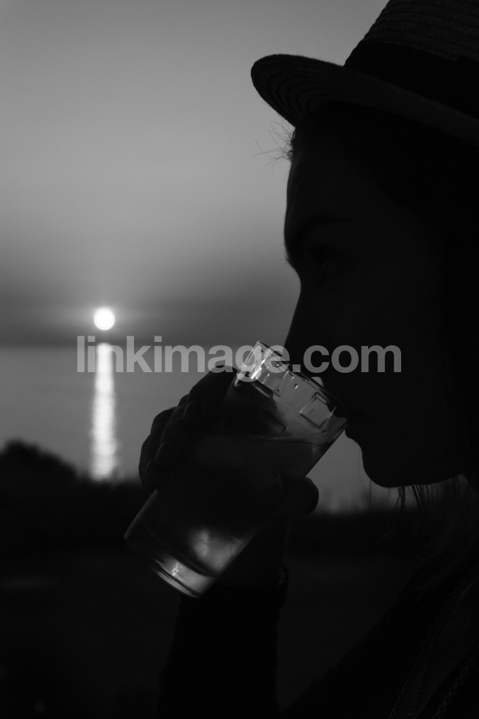 - sunset, silhouette, female, hat, glass, sea, hill, sun, reflection