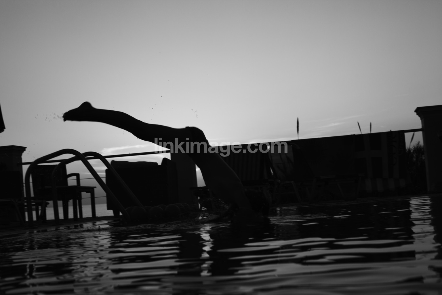 silhouette, pool, ladder, jump, dive, night, parasol, column, chair, water, girl, sunset, cloud, sun