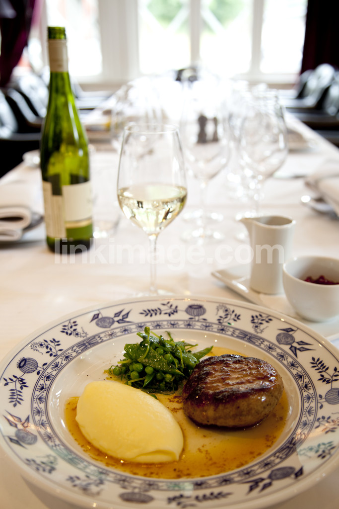 - meat, meal, restaurant, dinner, wine, plate, table setting, potato, mashed potatoes