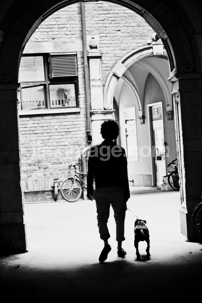 - dog, walk, master, leather jacket, eyeglasses, rasta, happy, pensive, city, asphalt, street, black, leash, backyard