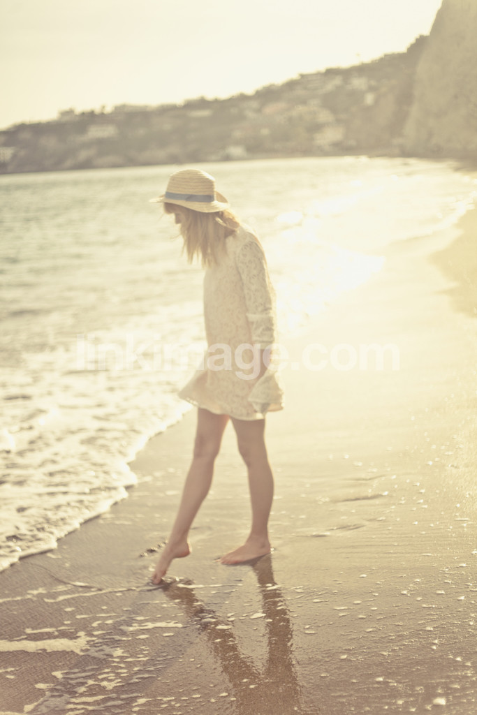 - female, girl, 20, 30, year, holiday, mediterranean, excursion, relaxation, shore, walk, dress, white, sunset, alone, hat, straw hat, blown, wind, romance, italy, ischia
