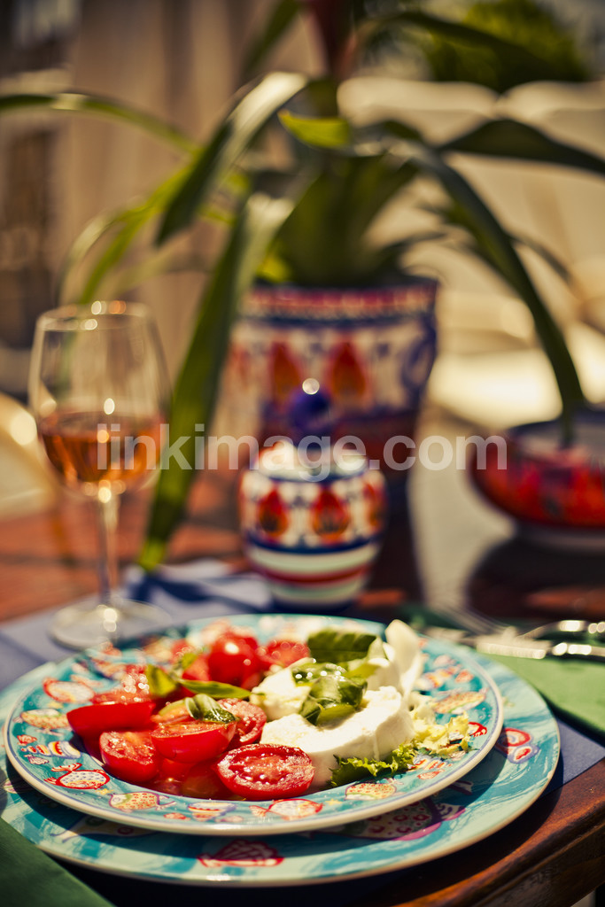 food, dinner, porcelain, mozzarella, tomato, basil, caprese, colorful, rose, wine, ducat