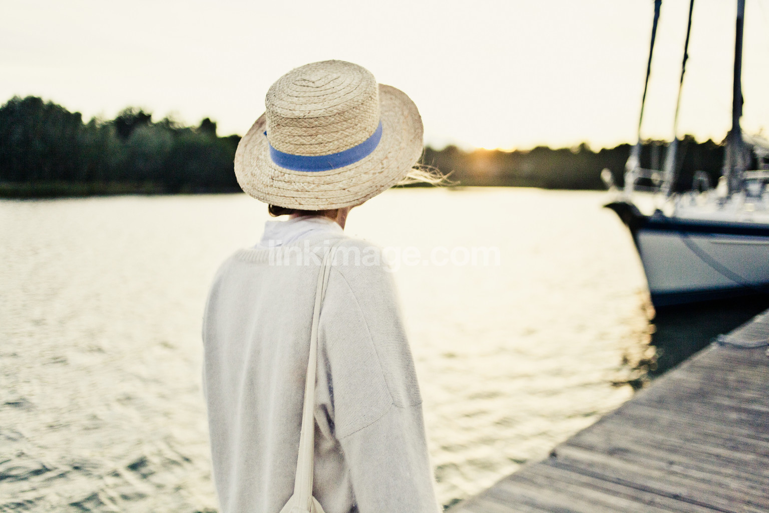 bridge, girl, female, hat, sailboat, sunset, walk, sail, port, water, sea