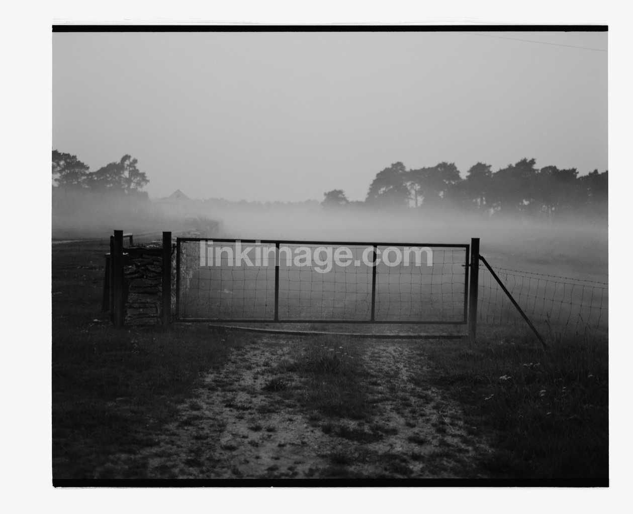 fårö, gotland, spot, gate, pasture, fog, horizon, dawn, dusk, weather, rural