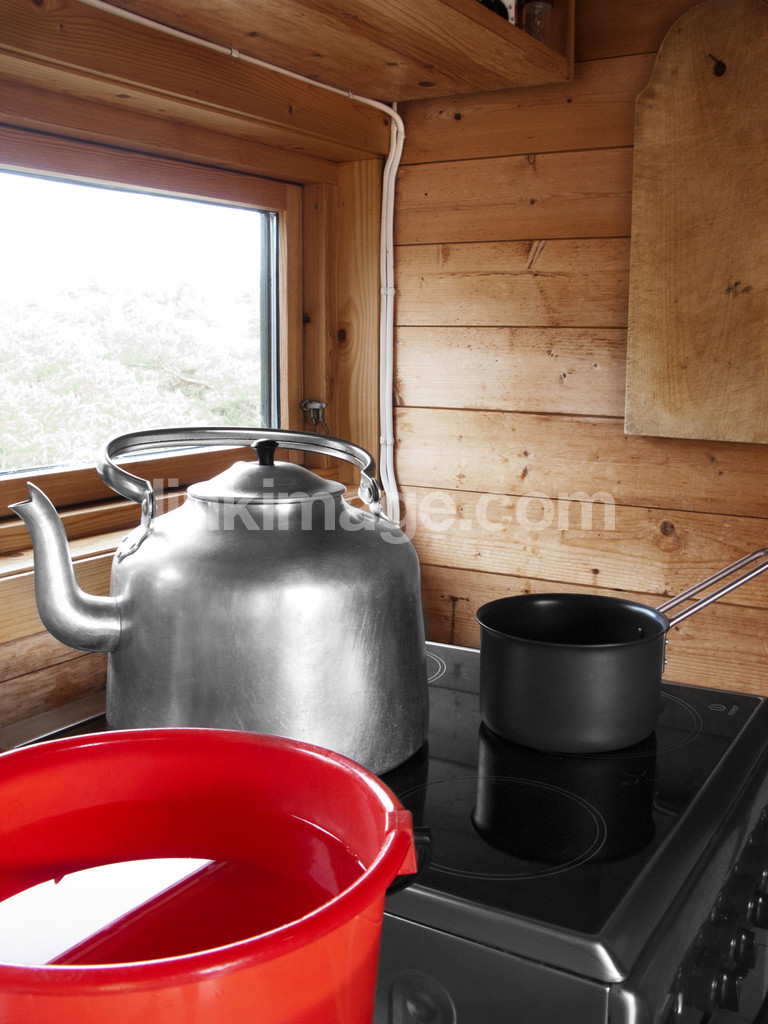 - kitchen, stove, tea, cauldron, sauce pan, water, vessel, red, bowl, black, cutting board, wooden wall, cottage