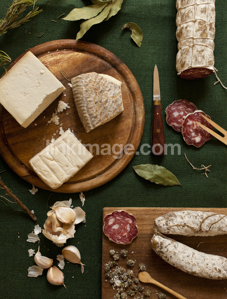 - matstilleben, italy, salami, laurel, rosemary, herbs, capers, garlic, cloves of garlic, cutting board, green, cloth, july, cheese, knife, wooden spoon, meal, table setting, delicacies