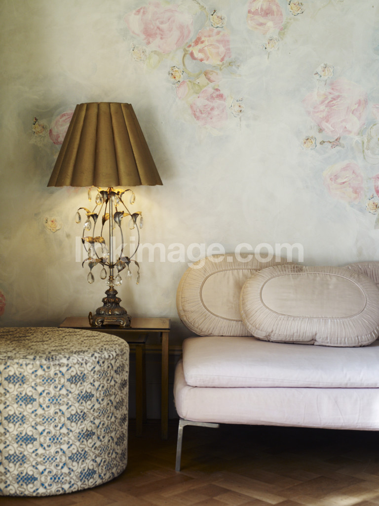 - living, sofa, footstool, lampskräm, hardwood floors, cozy, roses, wallpaper, pink, tip, british, home decoration, interior, private, home, pads
