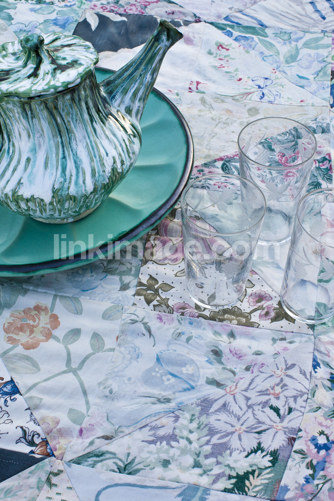 - table setting, glass, patchwork, crafts, thrown, barrel, teapot, tea, cloth, ceramics, preparation, evening light