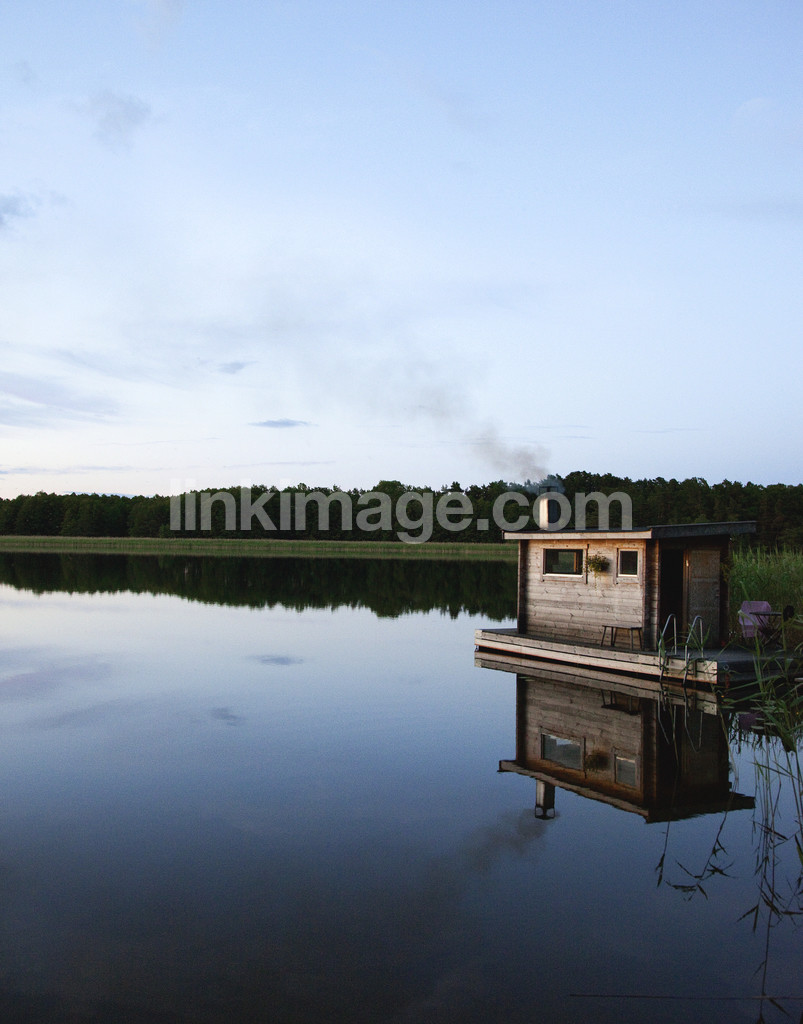 - flybastu, sauna, finland, sweden, heat, wooden sauna, woodburning, lake, forest, views, evening light, reflection, mirror, smoke, skosten, towel, ladder, reed, nature, mood