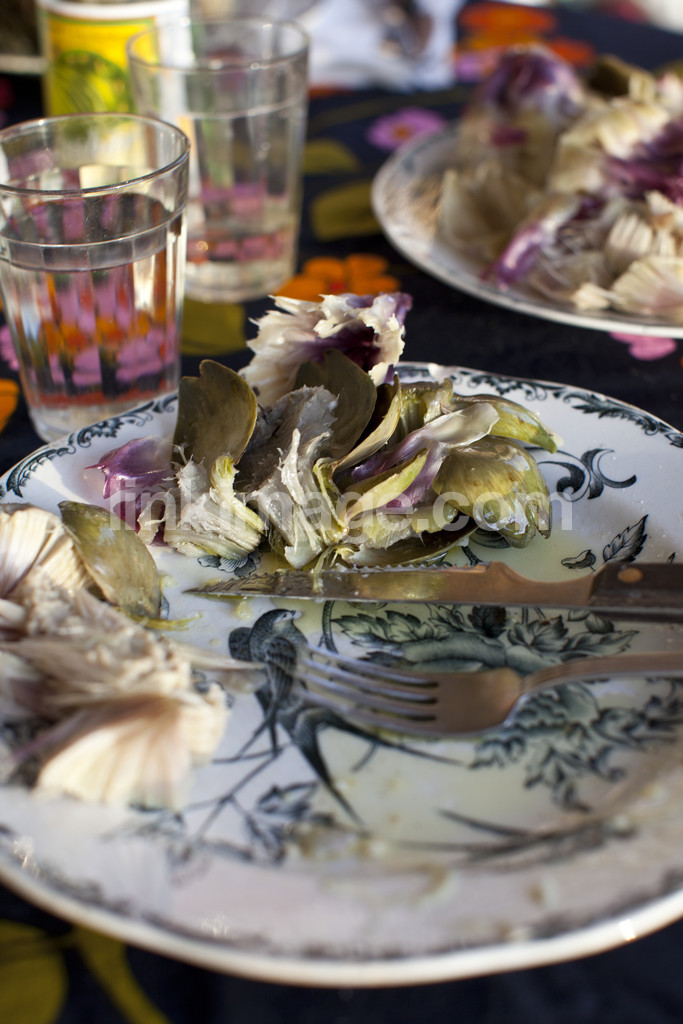 artichokes, meal, dish, water, glass, lunch, summer, cutlery, floral, cloth, food