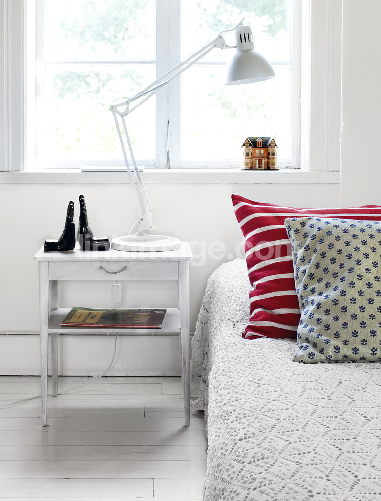 - bed, crocheted, bedspread, pads, window, natthusbord, bedside table, lamp, ornamental, things, book, journal, interior, summer residence, white, floor