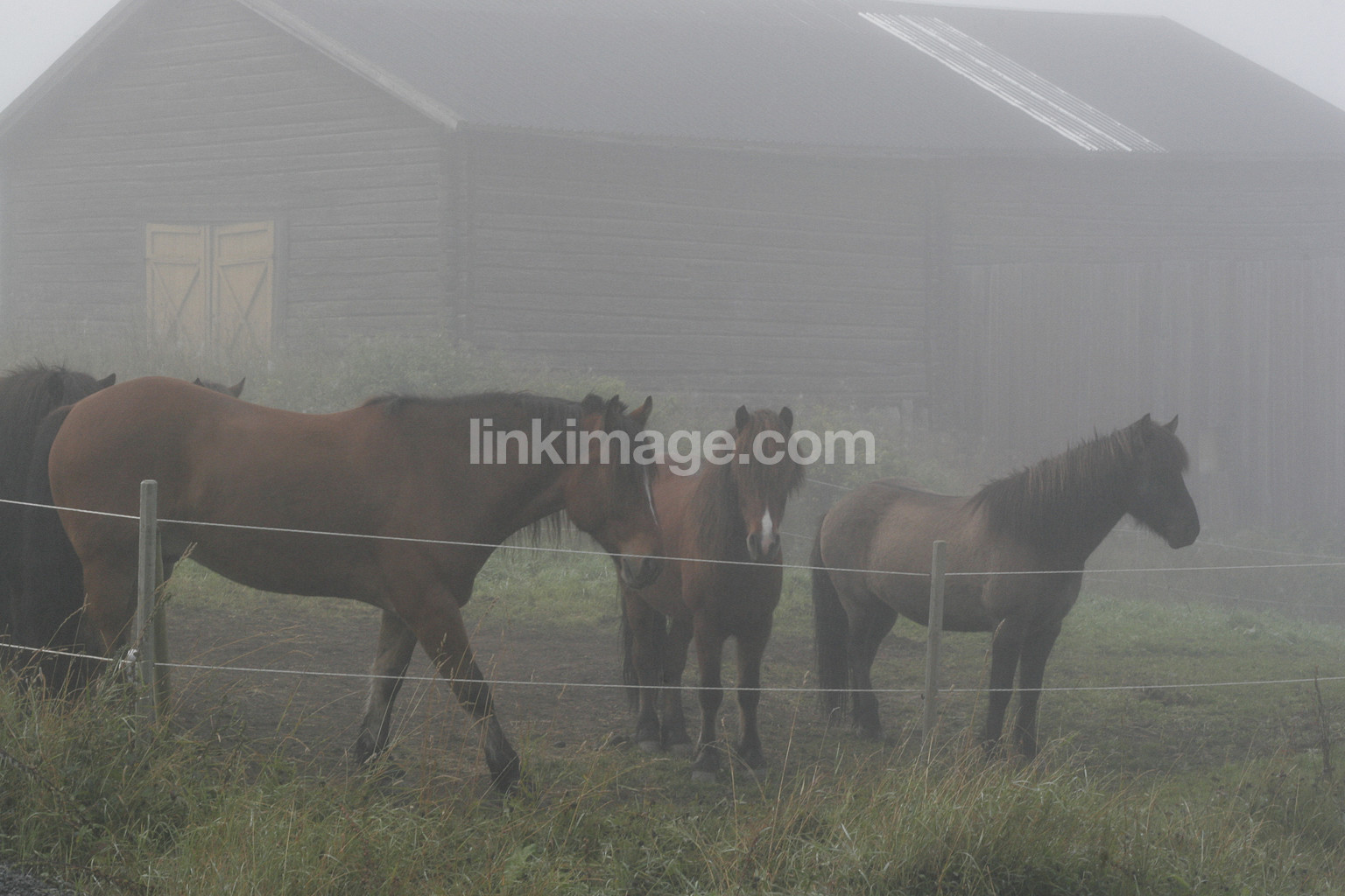 - brown, horses, cluster, pasture, on, bait, summer, morning, fog, wooden box, grass, meadow, riding school