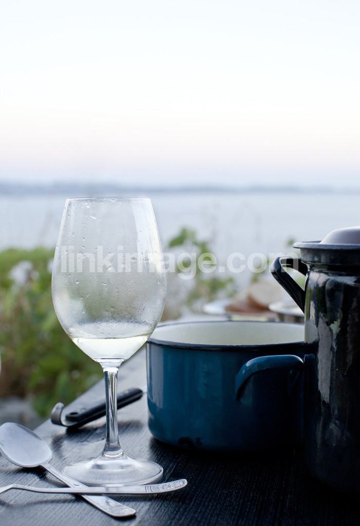 wine, wineglass, misty, glass, views, sea, marine, dusk, dinner, pots, cutlery, tabletop, greenery, outdoor