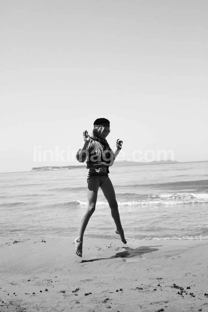 girl, children, sand, waves, foam, sea, sweater, horizon, rock, shore, jump, pasture, play, summer