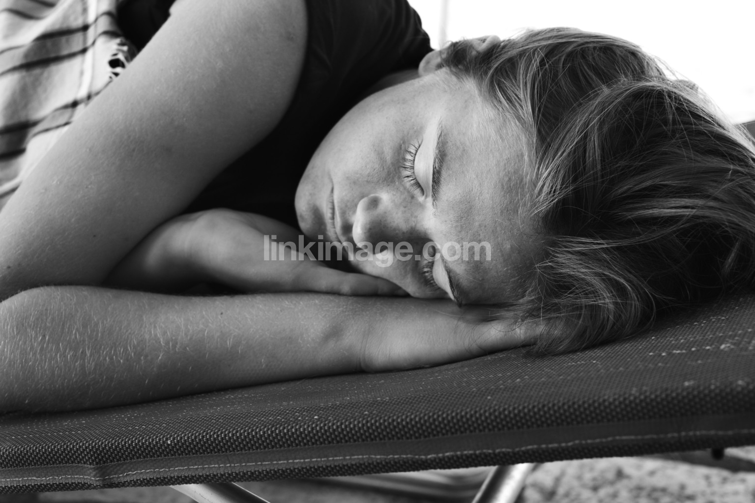 - female, girl, sleep, tired, hair, hands, gaze, tomorrow tired, nap, blanket, deckchair, rest, unscheduled, youth, teen