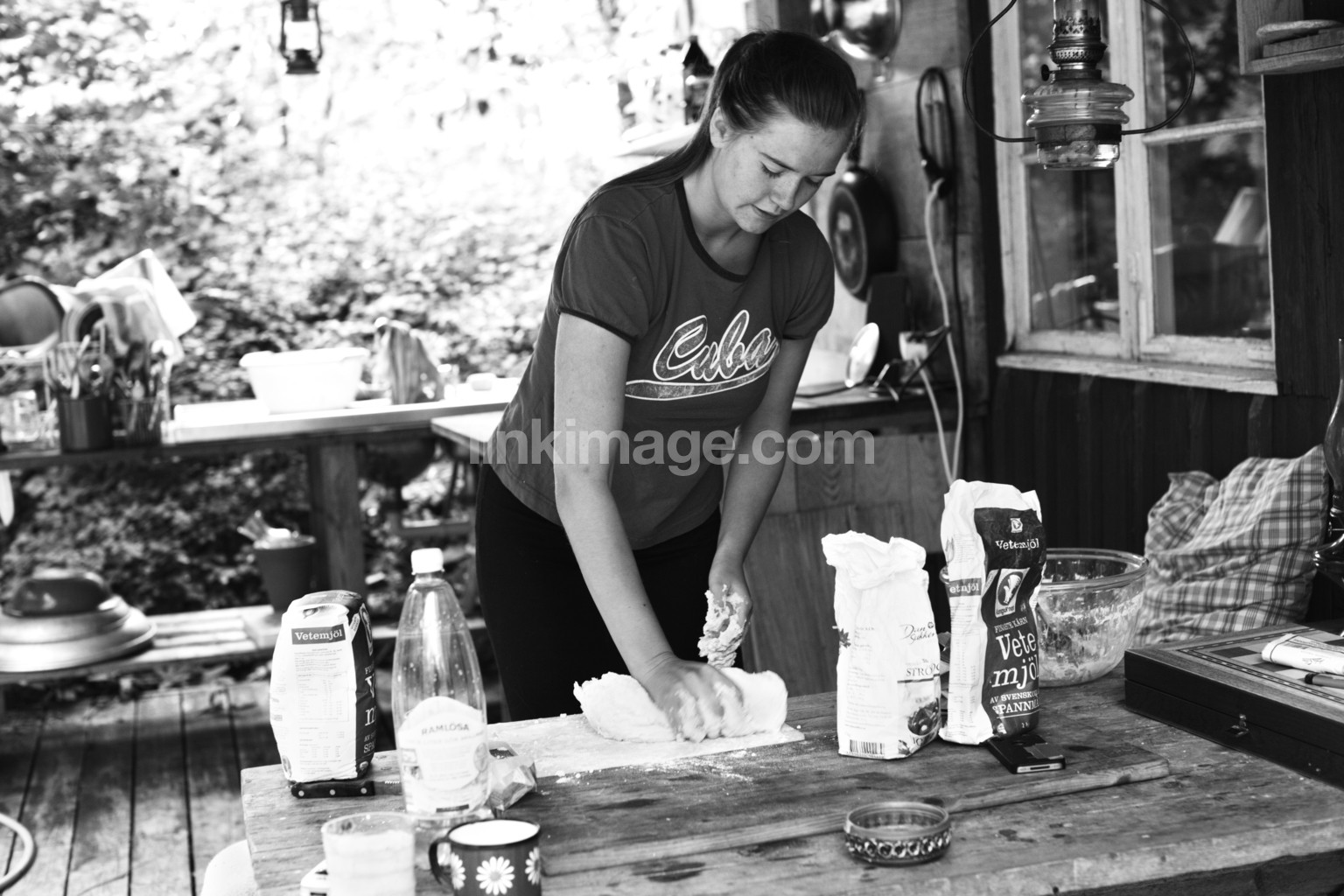 - baking, flour, female, oil lamp, house, window, wall, panel, outdoor, kitchen, plants, kneading, dough, bread, bake, forest, bush, interior, cottage, summer, girl