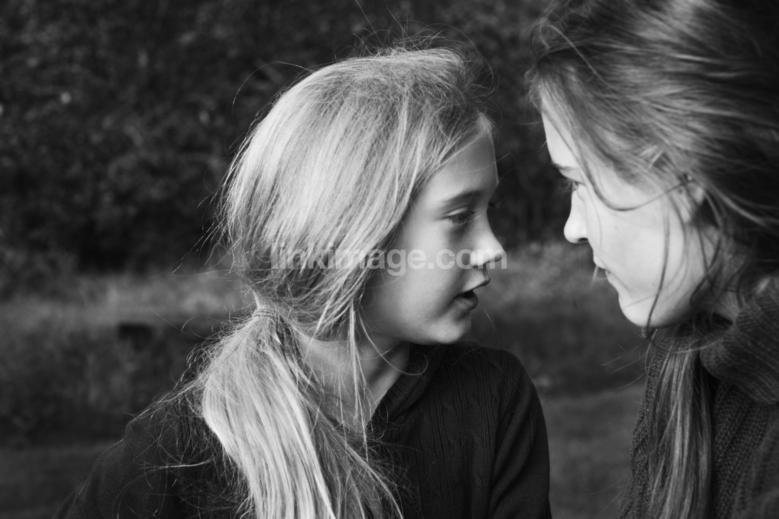 - girl, soft, hair, sense, sweater, wind, portrait, relaxed, girls, siblings, smile, meadow, birch, tree, knitted, bus, hood, turtleneck, security, family, together, two