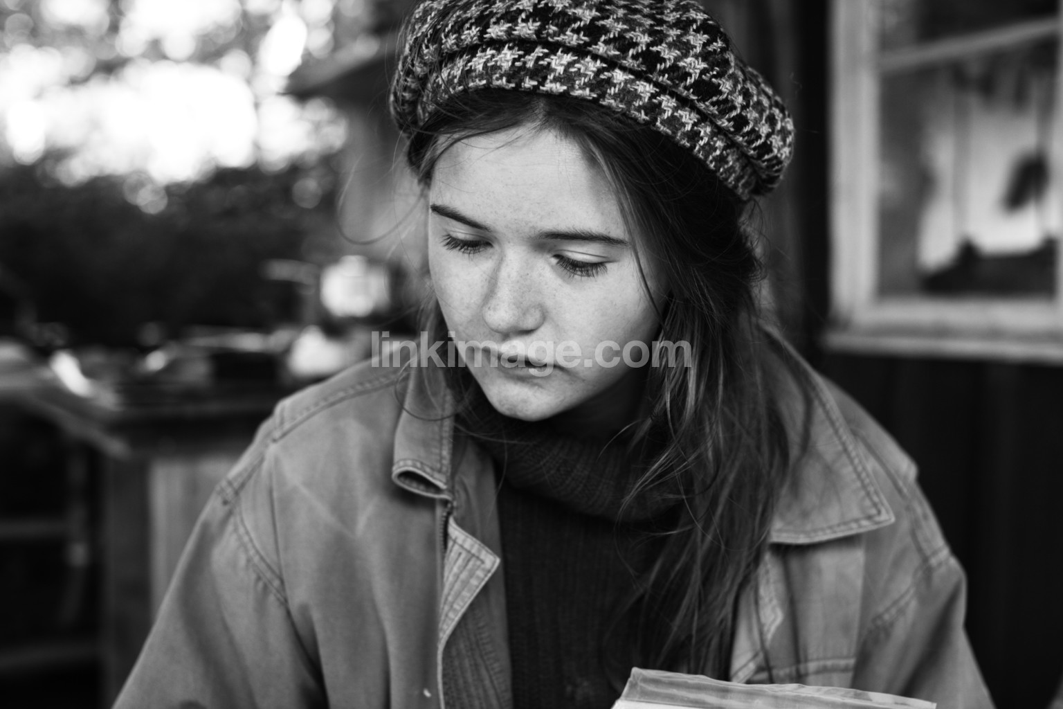 - girl, window, cap, knitted, hair, portrait, house, façade, drawing, turtleneck, sweater, jacket, youth, teen, hobby, model, summer