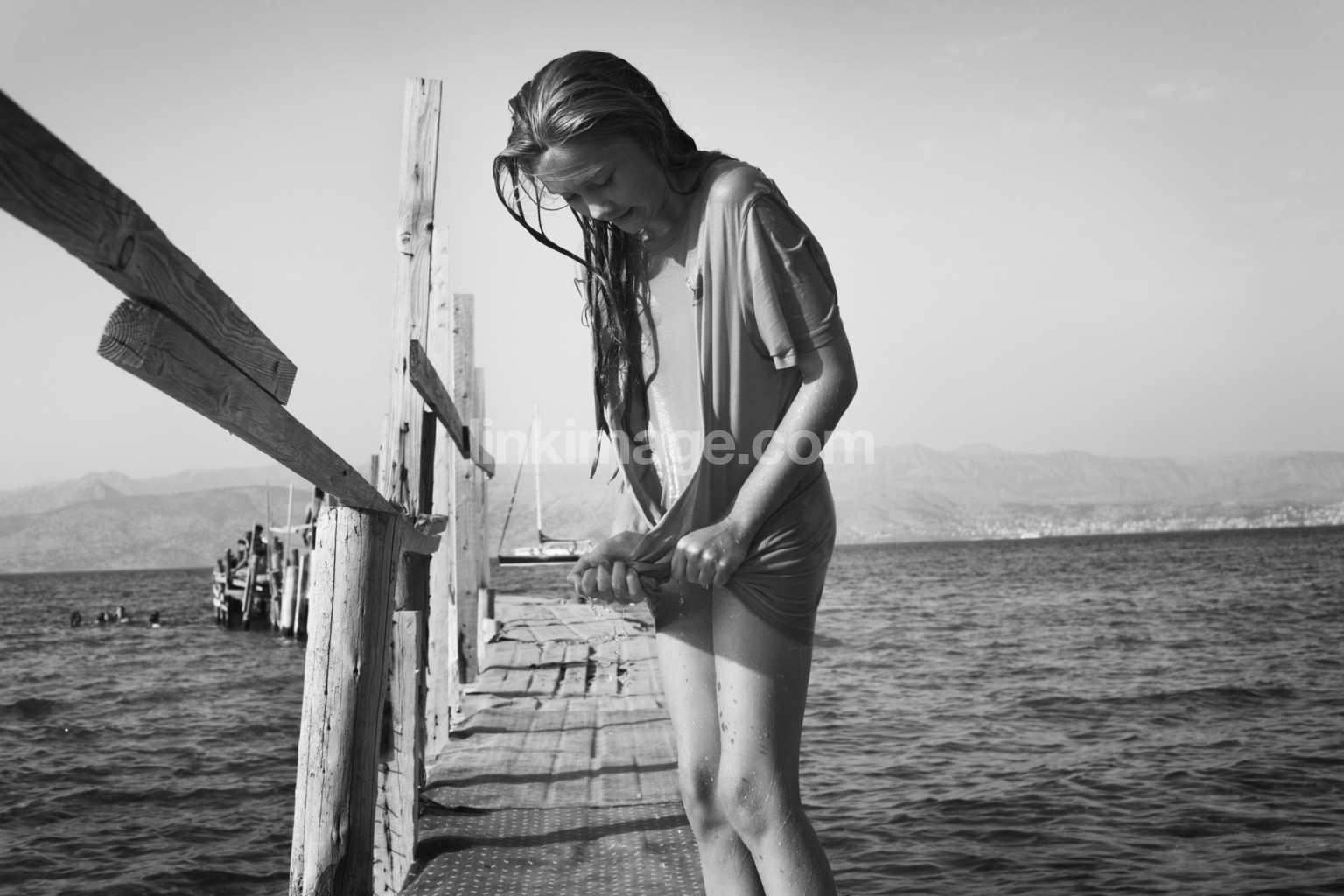 - sea, bridge, time, waves, water, wood, planks, rock, sun, shadows, shadow, railing, girl, wet, swim, tired, t-shirt, boat, sailboat, summer