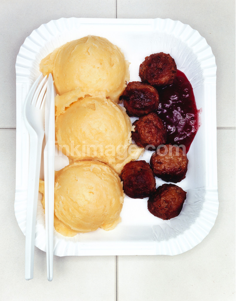- meatballs, creamed, mashes, potato, knife, fork, paper plate, plastic cutlery, jams, mashed potatoes, food, feed