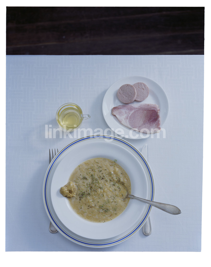 - food, tradition, food tradition, peas, split pea soup, table setting, tablecloth, soup, thursday, sausage, pork, punch, still life