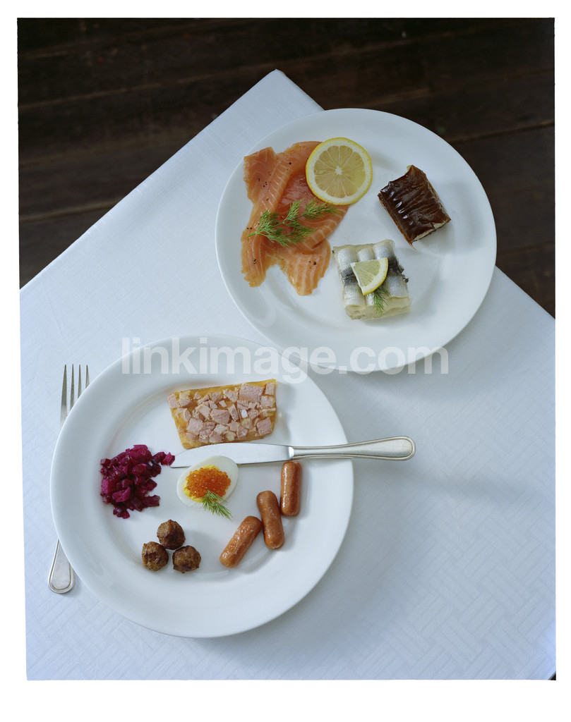 - food, food tradition, tradition, christmas dinner, july, feast, table setting, still life, salmon, brawn, sausage, plate, herring, fish
