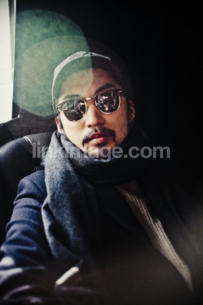 male, 20-30, year, sunglasses, scarf, cap, coat, sitting, serious, single, beard, mustache, asian, backlight