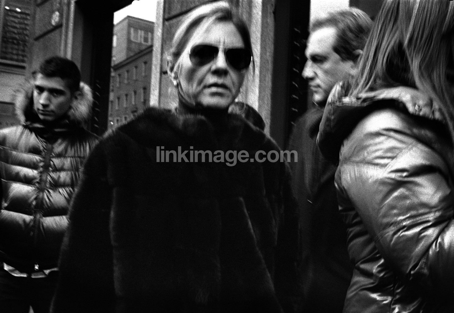 - folklore, pedestrian, people, sunglasses, female, winter, down jacket, city