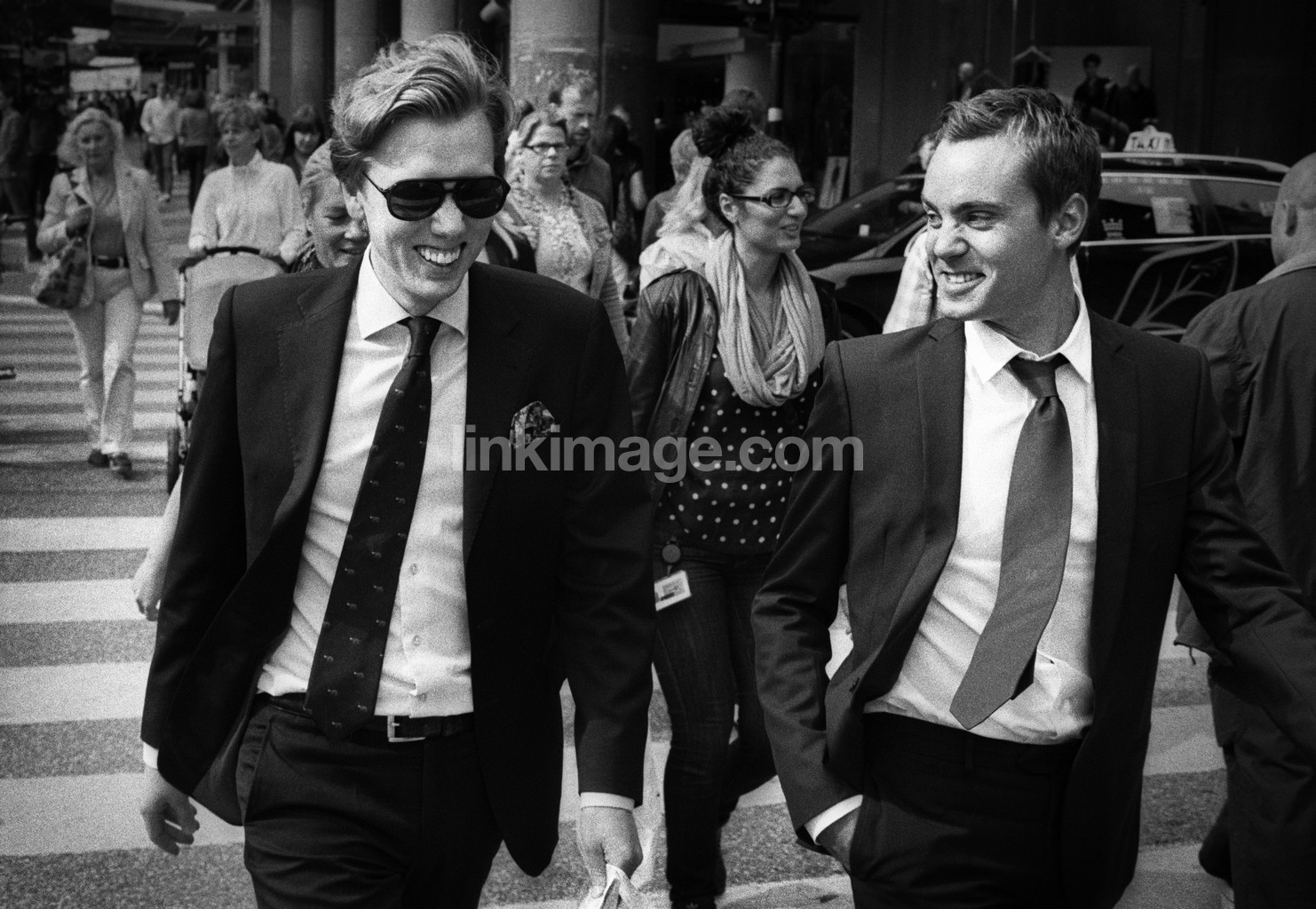 - male, tie, two, walker, street, pedestrian crossing, happy