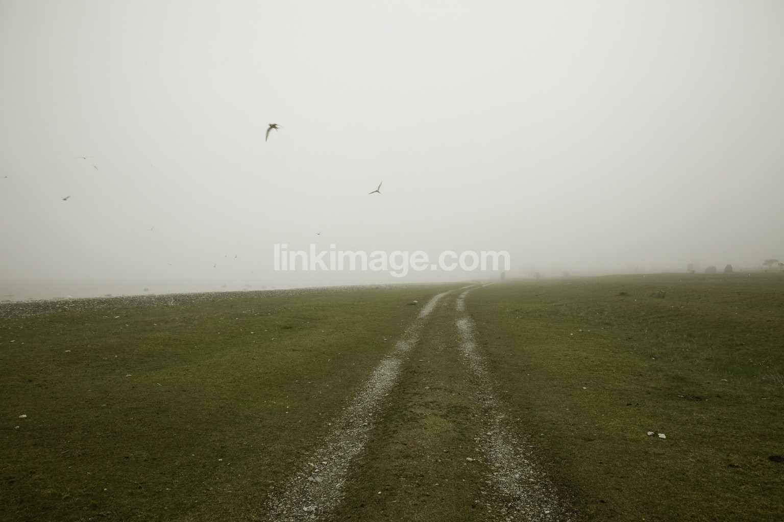 fårö, gotland, spot, fog, weather, road, gravel road, rut, track, horizon