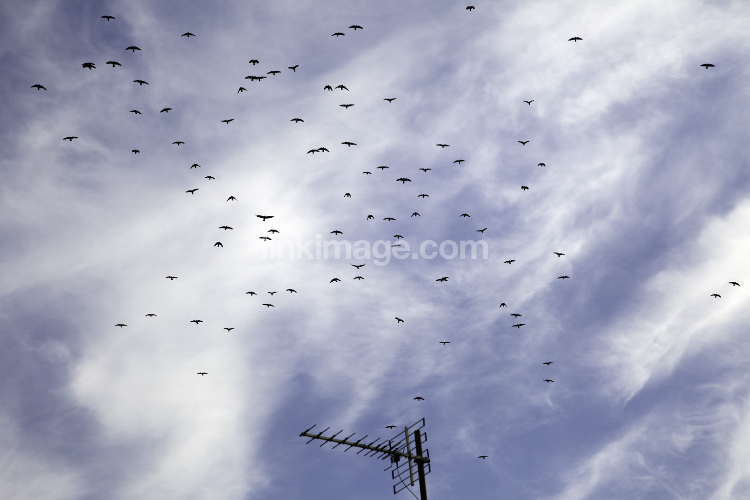 birds, jackdaws, floc, flock of birds, black, wings, fly, sky, cloud, antenna, tv