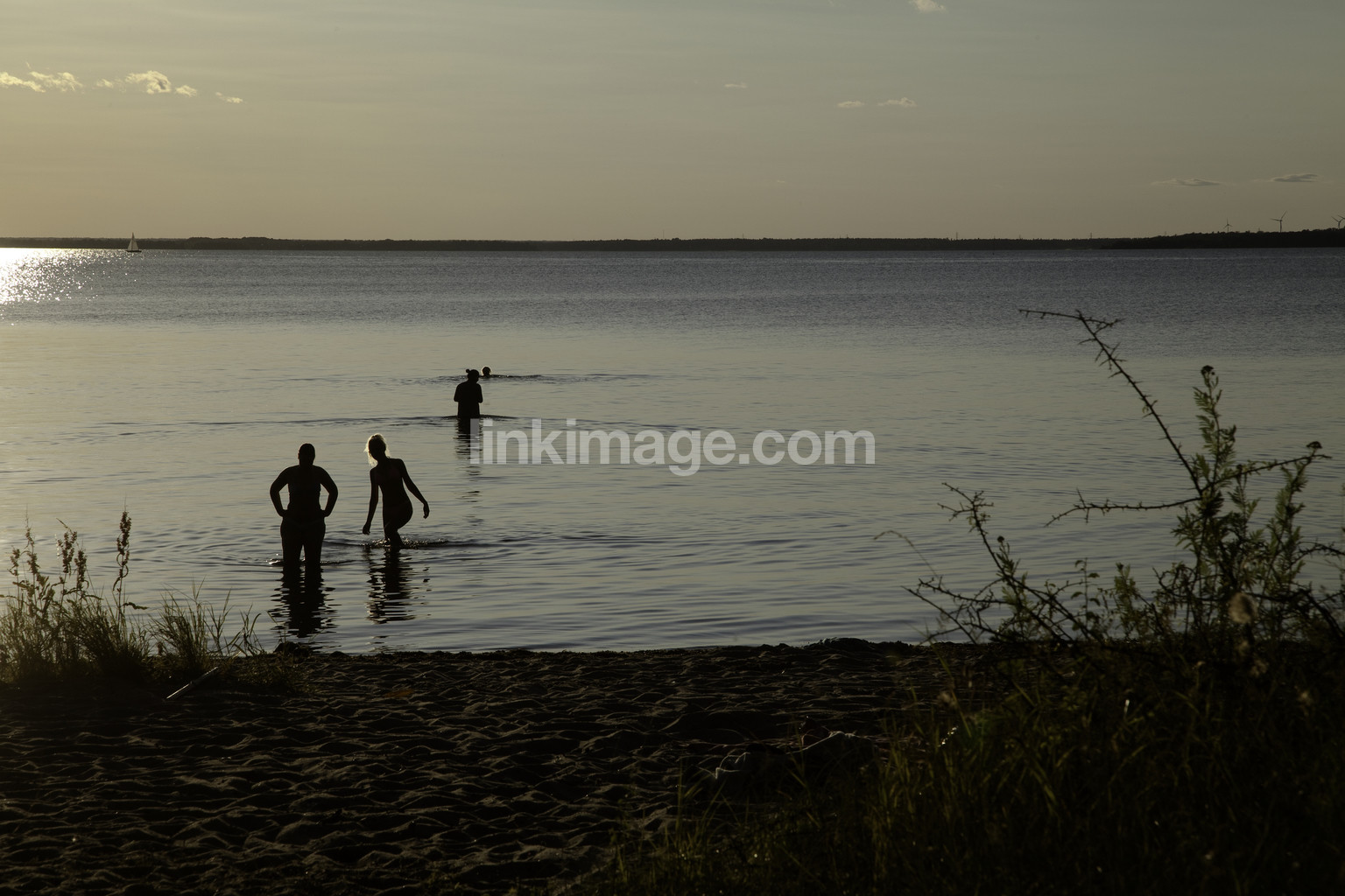 swim, summer, dusk, bath, sea, water, four, sandy beach, leisure, holiday, enjoying, beach, doubt, horizon, spot