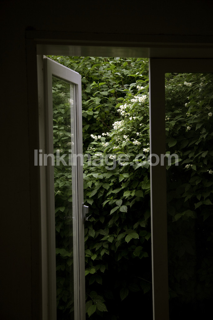 - door, doorway, open, bush, jasmine bush, summer, fragrance, sniff, flowers, jasmine flowers, glass door, country