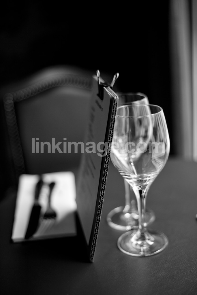 - restaurant, wineglass, glass, cutlery, table setting, black and white, menu, table