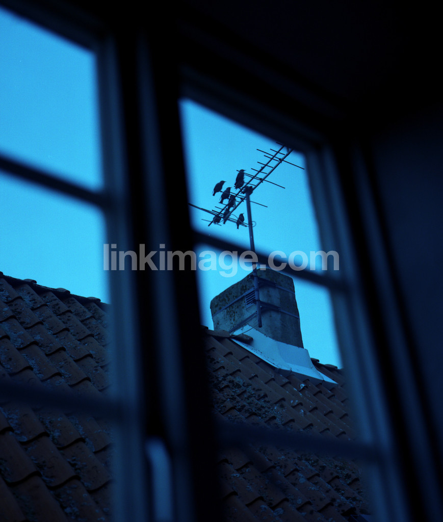 window, birds, views, ceiling, tv, antenna, blue, dusk, dawn, evening, night, stack, bk1058