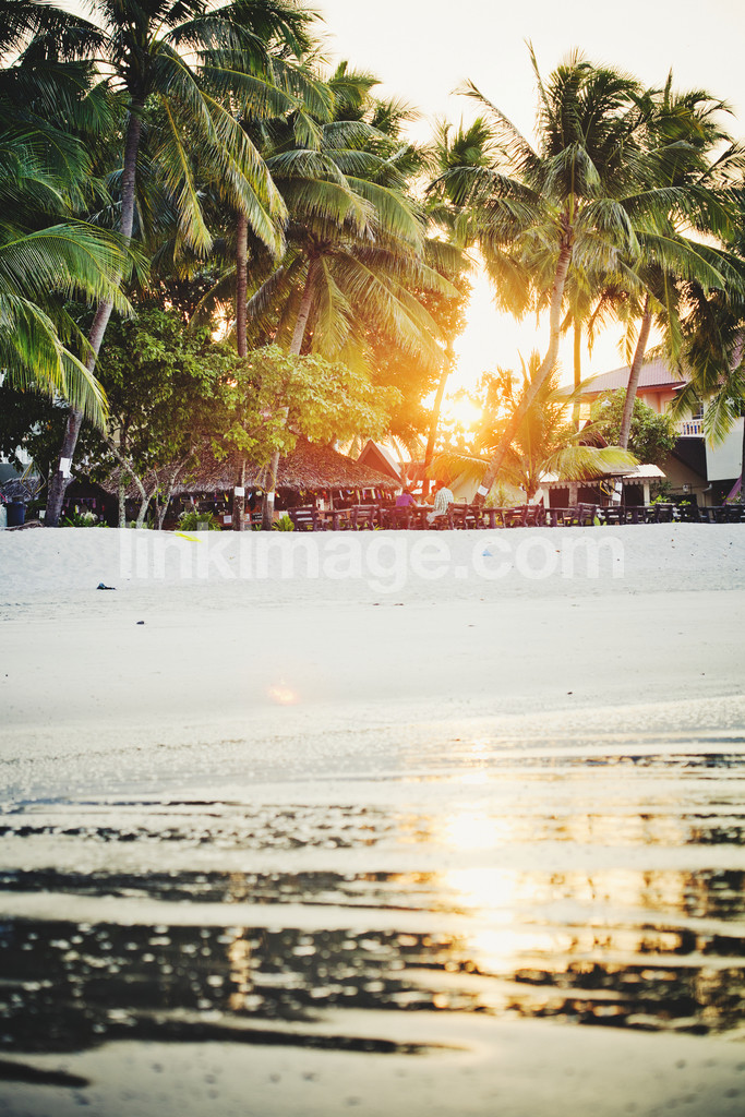 - shore, morning light, sunrise, sunset, malaysia, island, tropics, palms, palm, sea, fate, beach house