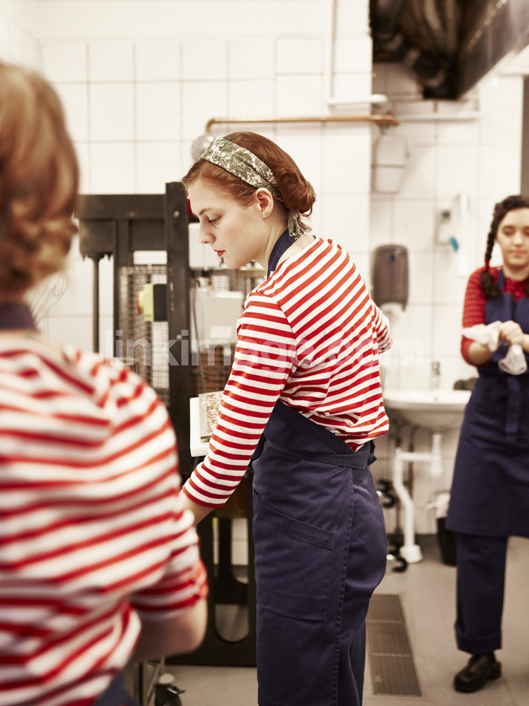 - factory, candy, confection, workplaces, women, girls, striped, kitchen