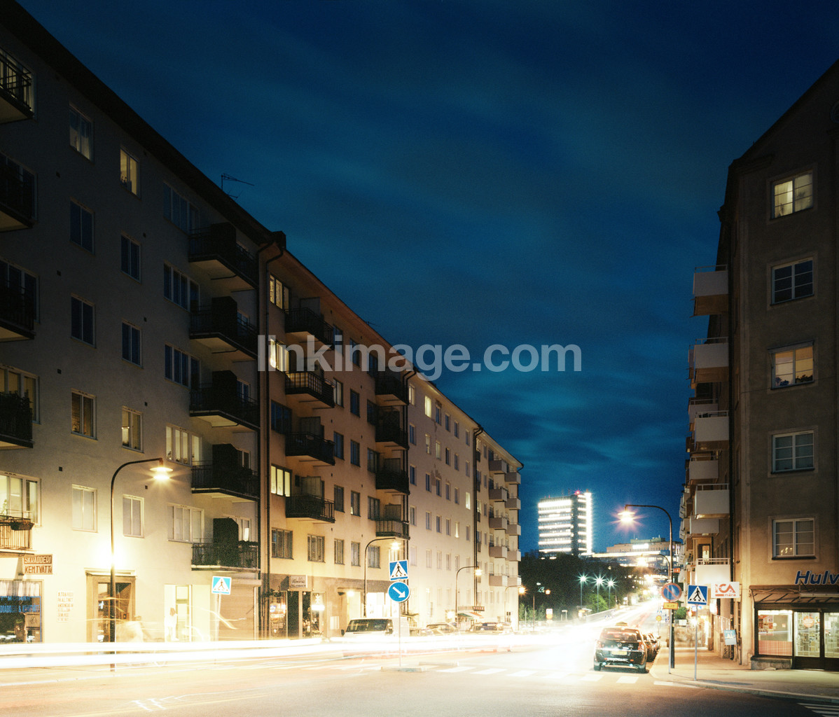 small, essingen, stockholm, suburb, night, evening, summer, street, lit, light, lights, home, housing, tenancy, condominium, lägnenhet