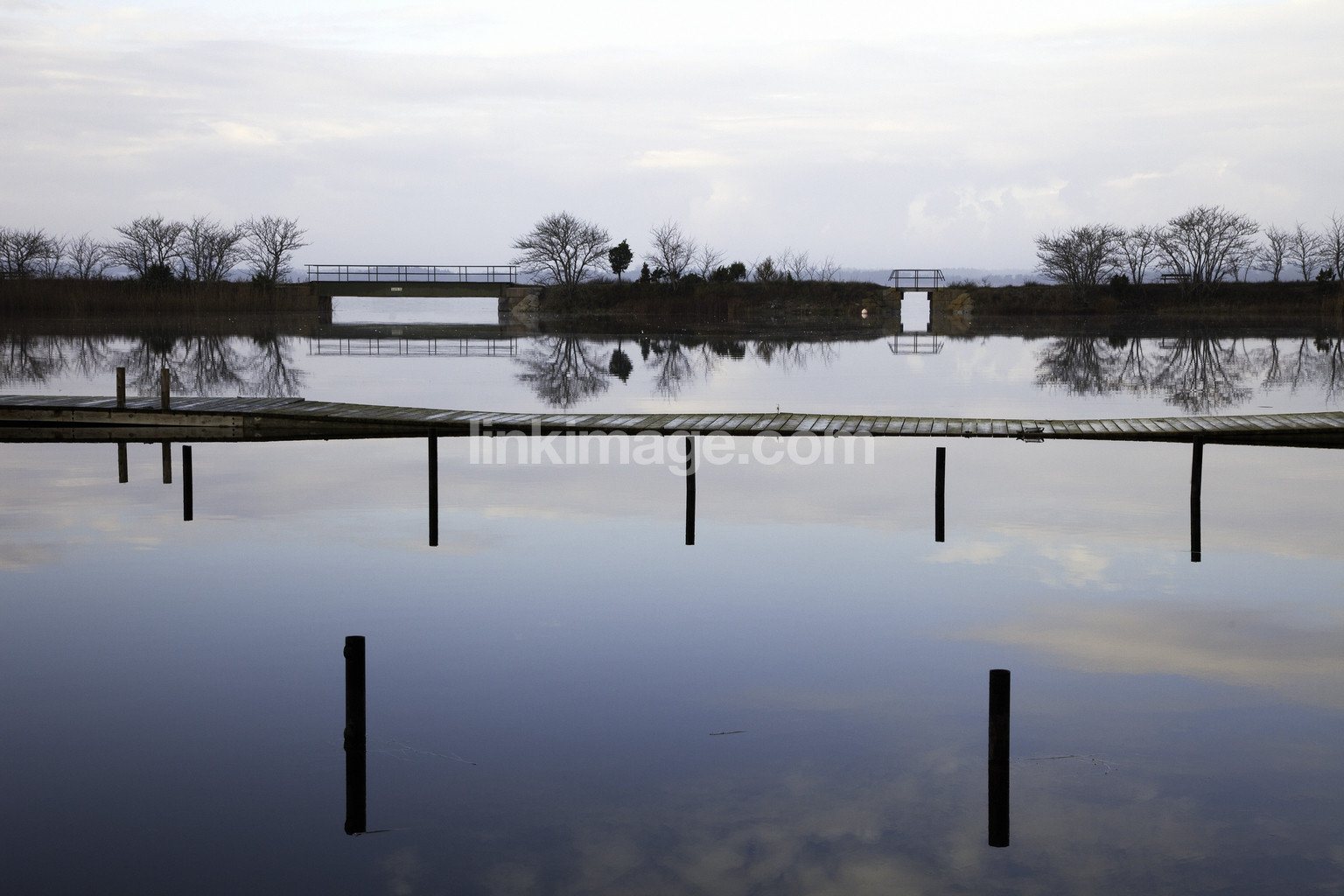 spot, water, bridge, graphic, tree, two, reflection, reflex, cloud, water surface, still, harmonic, colors, sky, surface
