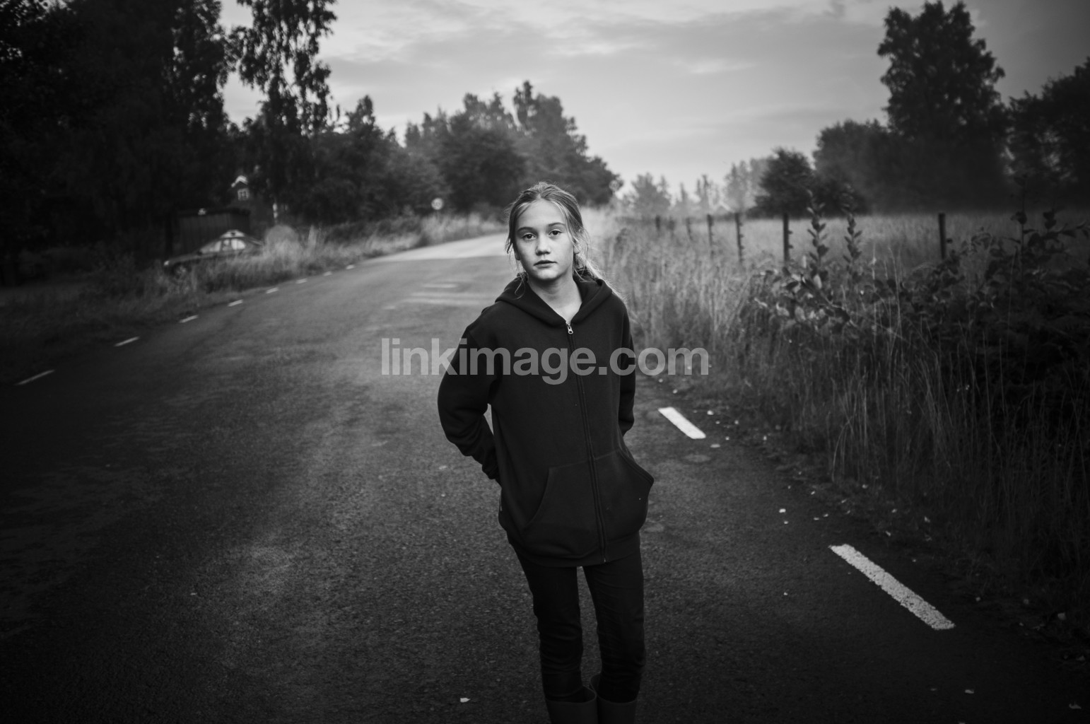 leaf, tree, fog, mystery, sky, forest, cloud, girl, road, sweater, hoodie, fence
