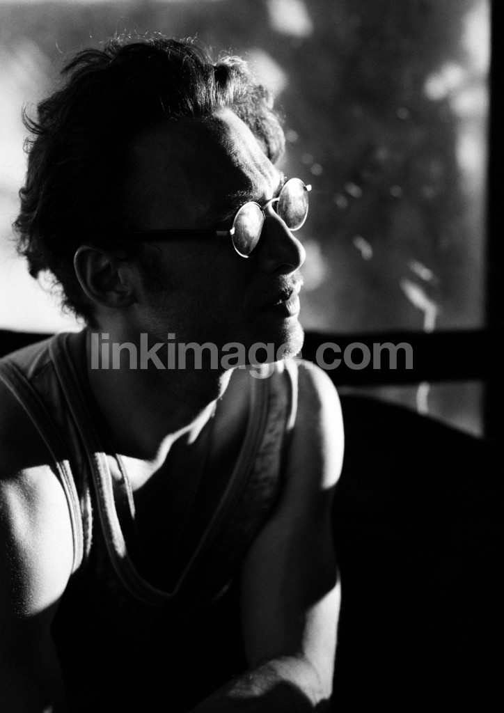 - attitude, gaze, cool, focused, contrast, lines, curly, male, fashion, model, portrait, trip, shadow, sun, sunglasses, black and white, tourism