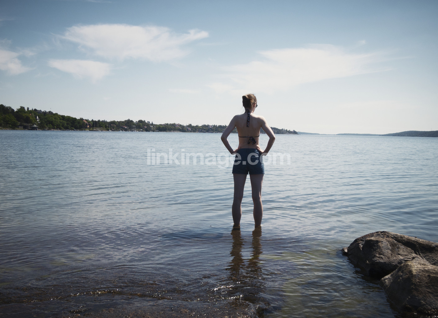 - stockholm, sunny side, wade, bathing, female, an, person, shorts, solar, sky, blue, cloud, stone, shore, summer, rocks, bikini, looking, sunglasses, back, water