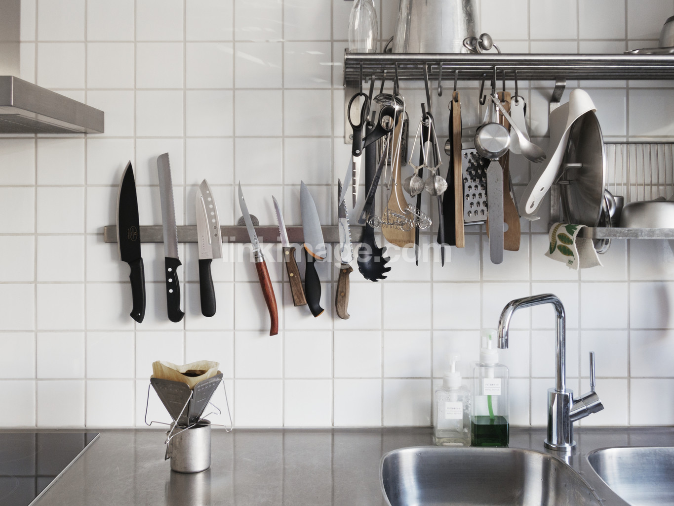 kitchen, coffee, drip coffee, drip, filter, mug, cup, conveniently, provisionally, knife, knives, knife drop, tile, sink, stainless, reflection, faucet, kitchenware, shelf, stove, pour, fan, pot lids, glass, bib, measurement, scissors, grater, tea strainers, tea strainer, dishcloth, dish soap, soap, bottle