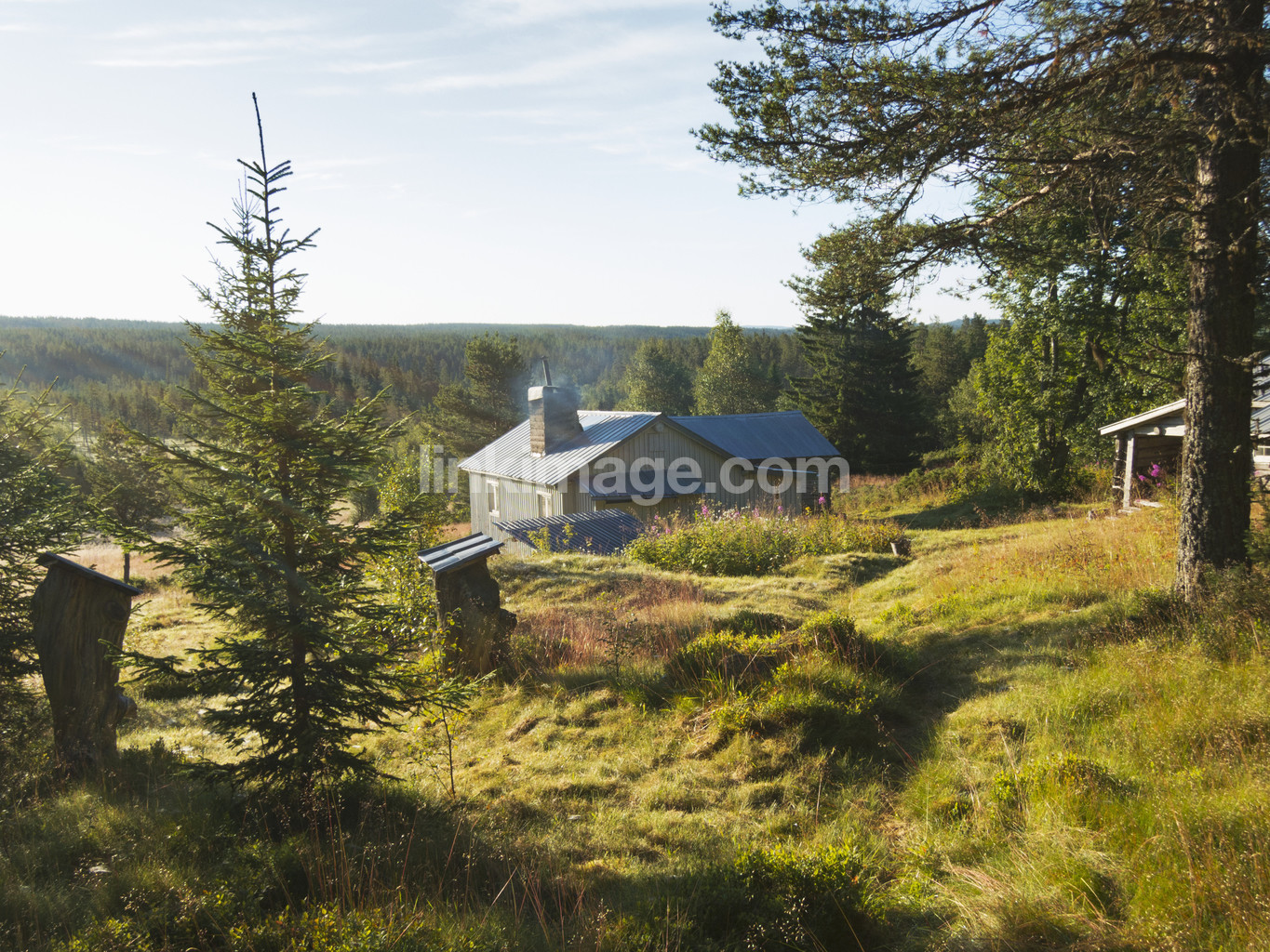 - ytterberg, härjedalen, mountain pasture, house, country, holiday, summer, country life, smoke, stack, spruce, tree, forest, yard, grass, outbuildings, cottage
