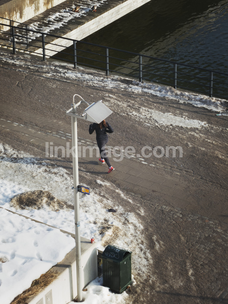 - run, exercise, runs, female, girl, skanstull, winter, snow, trash, lamp, water, fence, bridge, ducks, birds, cold, healthy, road, setts, gravel, shadow, sunny, on