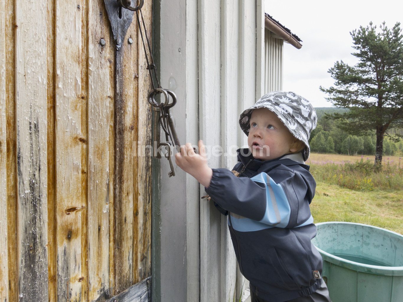 - härjedalen, mountain pasture, boy, guy, children, house, cottage, country, holiday, summer, keys, lock, open, raincoat, hat, forest, tree, grass, softwood, pine, water, drag, snatch, tear, bunch of keys, door