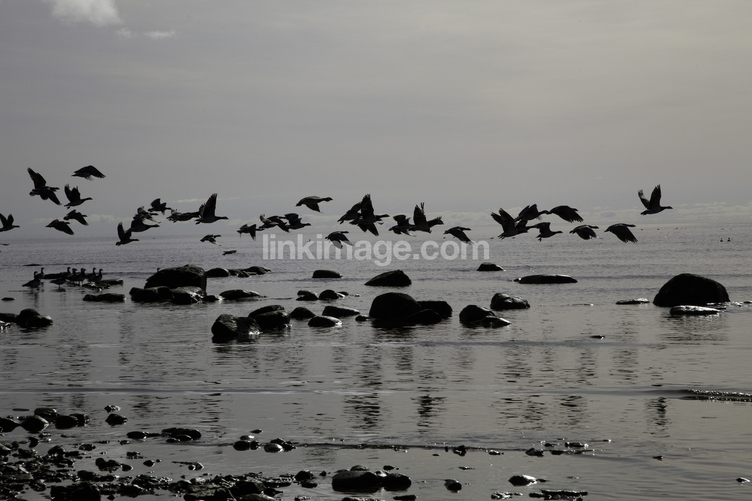 birds, geese, fly, nature, floc, wings, light, sea, water, sky, stones, horizon