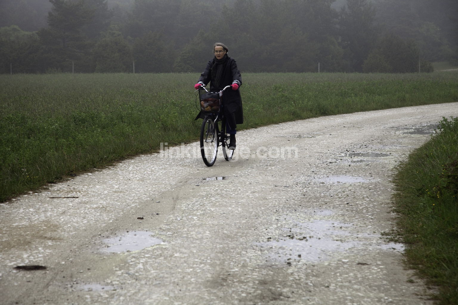 cycling, woman, older, pensioner, country, road, gravel road, mittens, color, cycle, red, curve