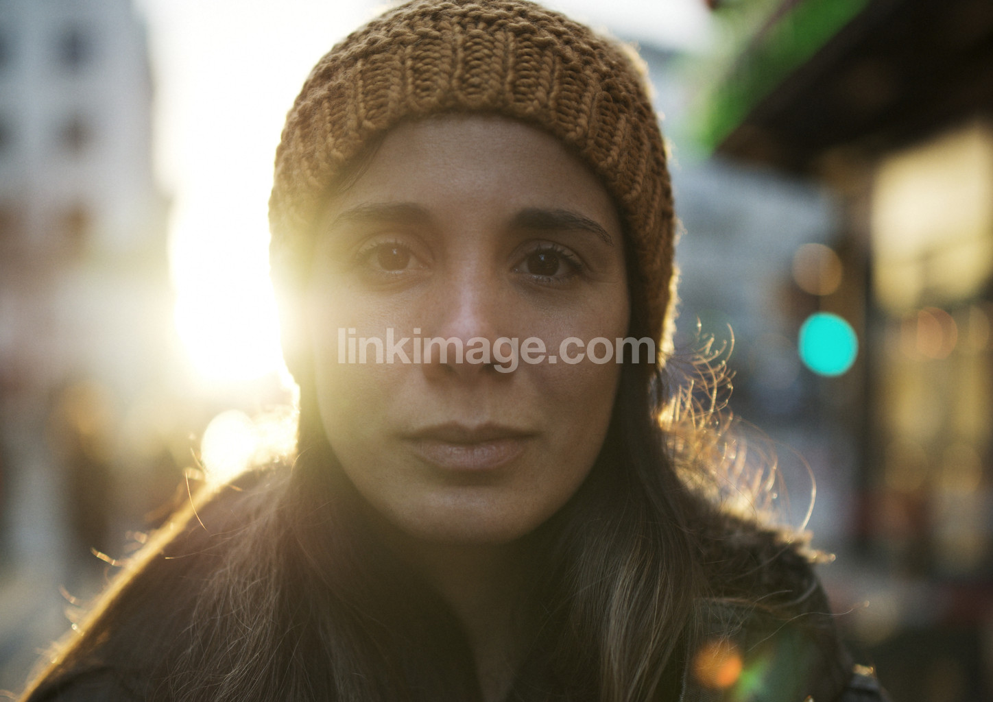 - face, argentines, argentine, relaxed, gaze, brunette, yellow, gold, jacket, woman, backlight, cap, orange, portrait, serious, sun, sunset, sunbeams, city, difficult to interpret, hispanic, hot, strong willed, winter, honest, honesty, eye contact